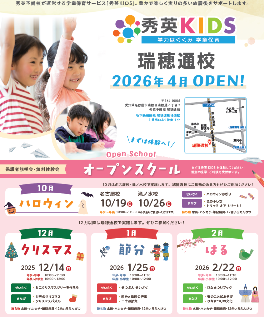 2026年4月、新しいKIDSが誕生します! 「秀英KIDS 瑞穂通校」 名古屋で3つめの秀英KIDSです。よろしくお願いいたします♪
