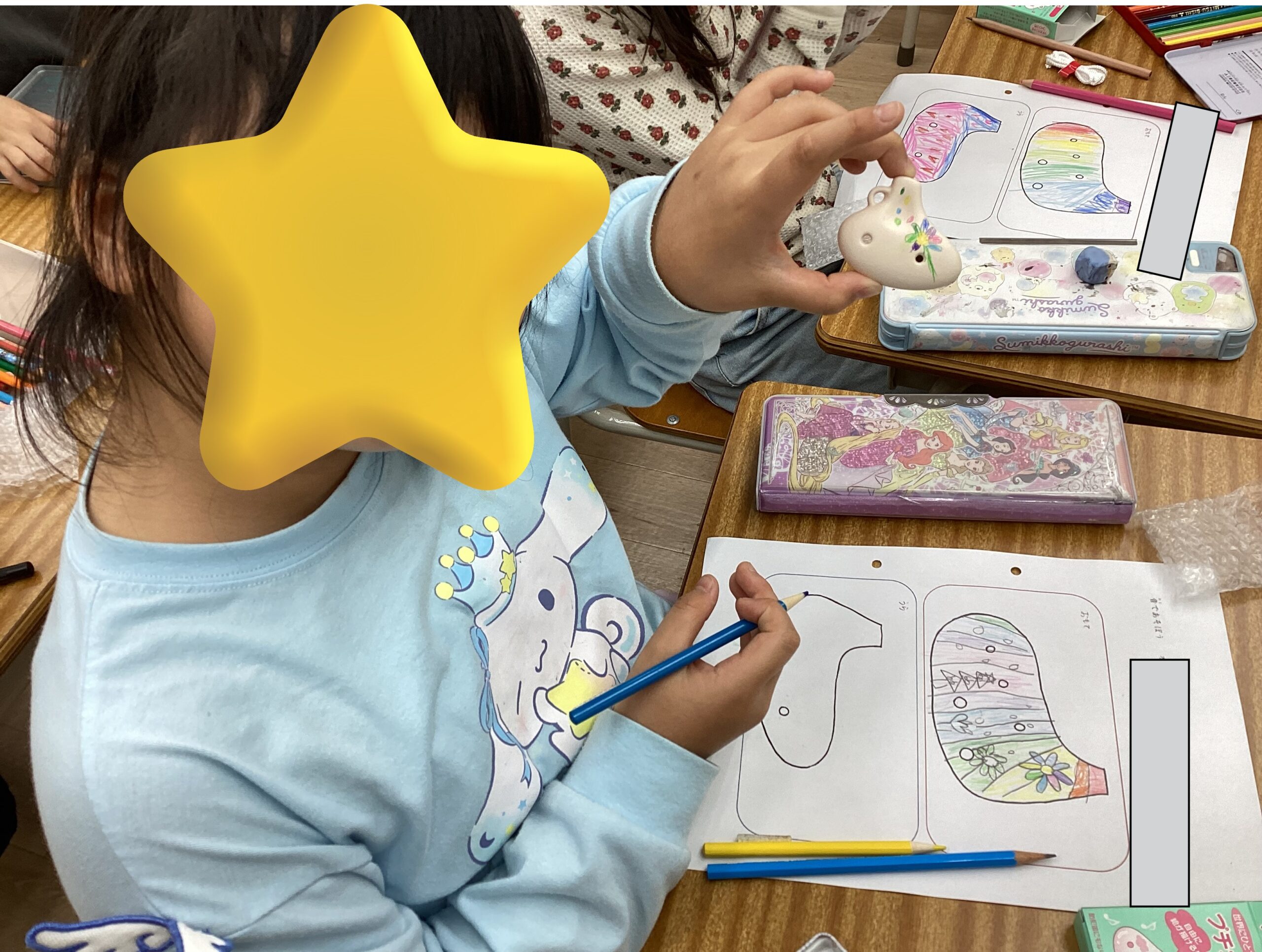 本日は、水曜プログラムの「音で遊ぼう~楽器~」をご紹介します。1学期にも「音で遊ぼう」のプログラムを実施し、オカリナについて、オカリナの演奏方法について、学びました。今回は、第2回目で、世界に1つのオカリナづくりを実施し、オカリナに直接好きな絵を描いていきました。立体に書くことが難しく、下書き通りに描くことができない、という子もいましたが、みなさん楽しんで取り組んでくれました✨