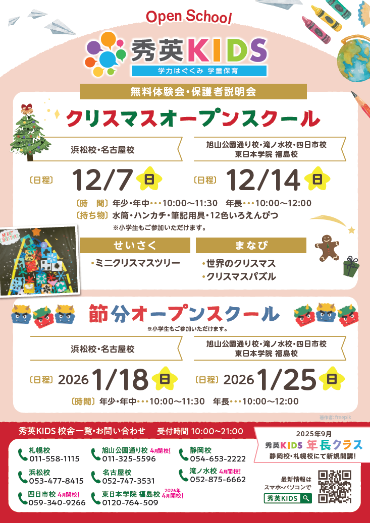 12/14(日)にクリスマスオープンスクールを開催いたします。参加受付スタートしています。