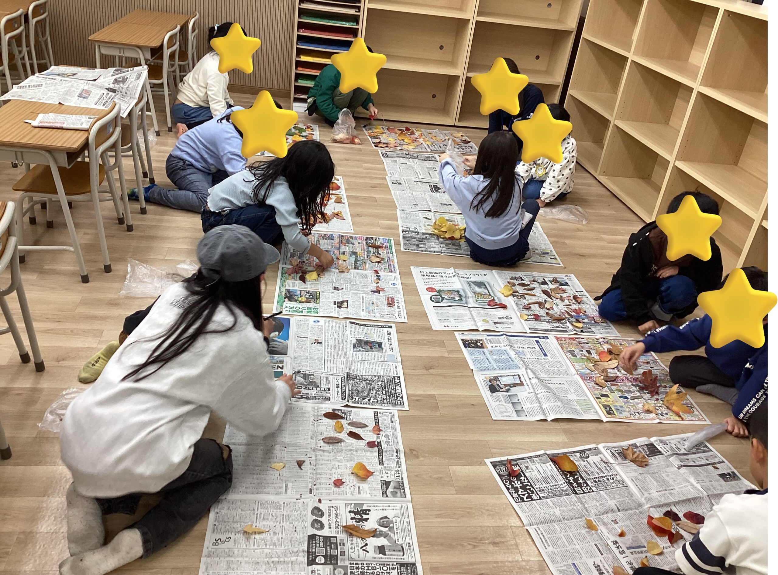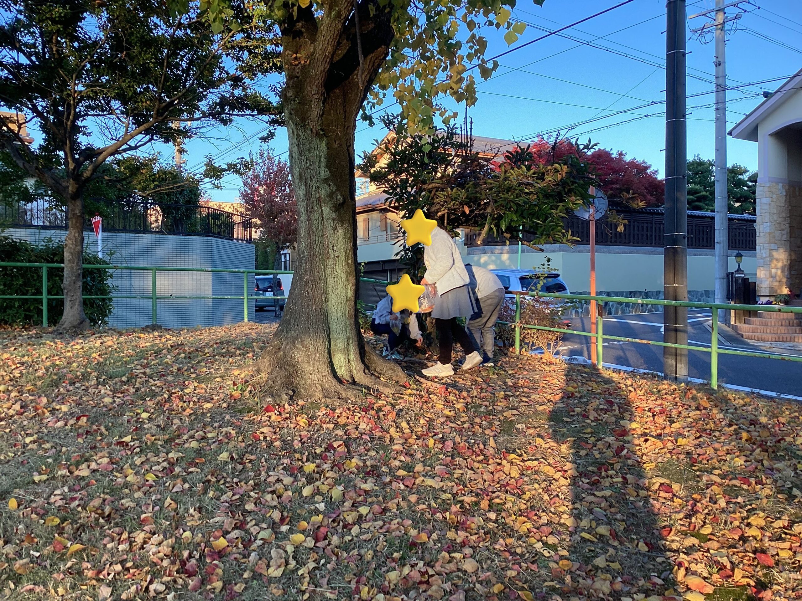 秋も深まり、朝夕はだいぶ冷え込むようになりました。滝ノ水校の目の前の木も、少しずつ紅葉し始めました。今回と次回の水曜プログラムでは、「季節を味わおう」をテーマに、落ち葉でアートを作成します。今回は、アートの準備として、落ち葉ひろいに出かけました。公園に行き、紅葉した葉っぱをたくさん拾ってきました。落ち葉を拾った後は、来週のアートに向けて、押し葉づくりをしました。「早くアートを作りたい!」「葉っぱで車を作りたい!」など、みなさん楽しみにしていました✨次回はどんなアートができるか楽しみです🍂