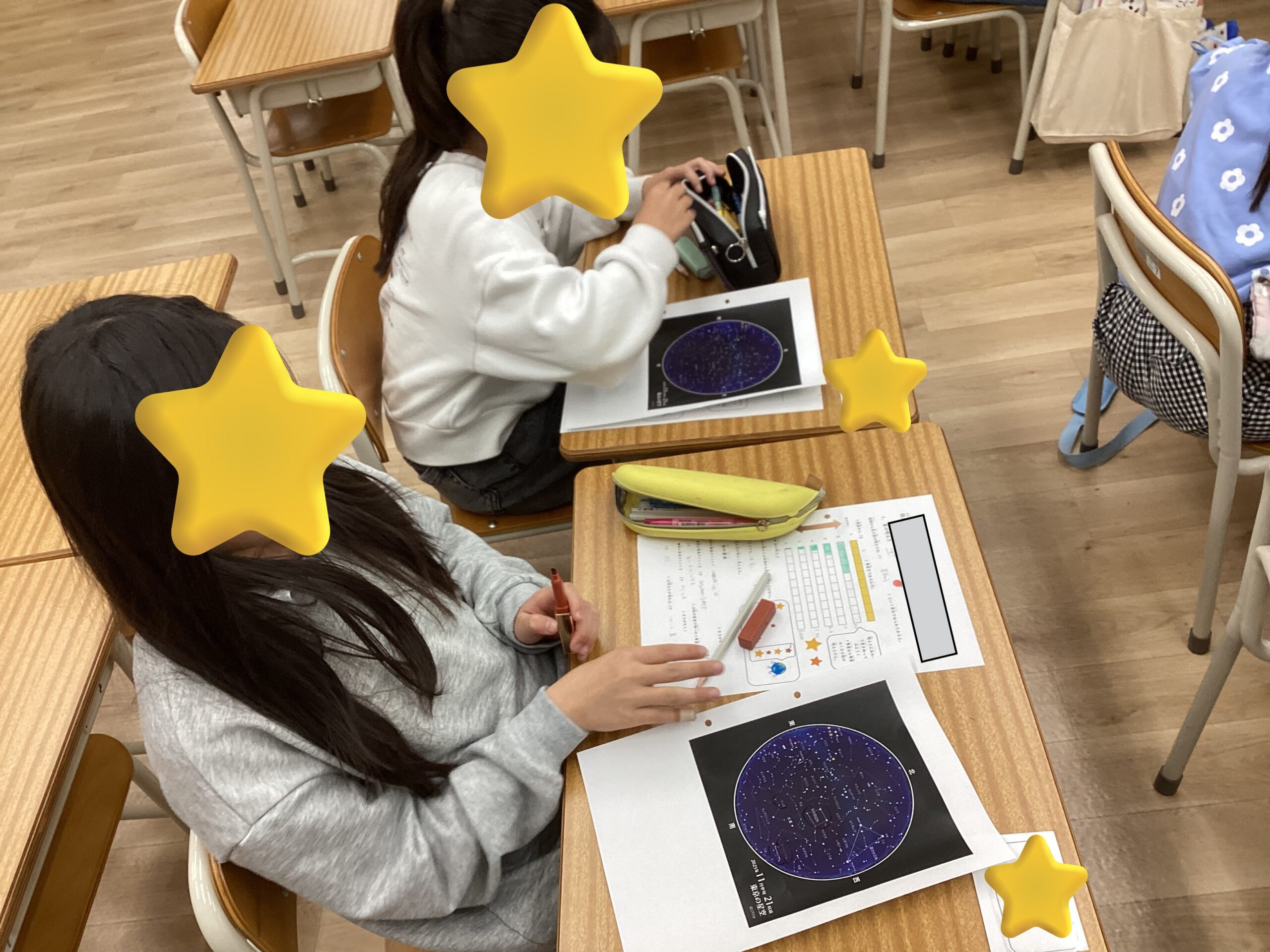 本日は、木曜日の理科まなび~秋の星座~についてご紹介します。星の明るさや、クジラ座、カシオペア座、など秋の星座のお話について学びました。星座表を見ながら、星座について学び、とても楽しんで取り組んでくれました☆「今日、空を見て星座を探してみたい!」「山に行って、きれいな星を見たい!」など、みなさん星や星座に興味を持ってくれました✨