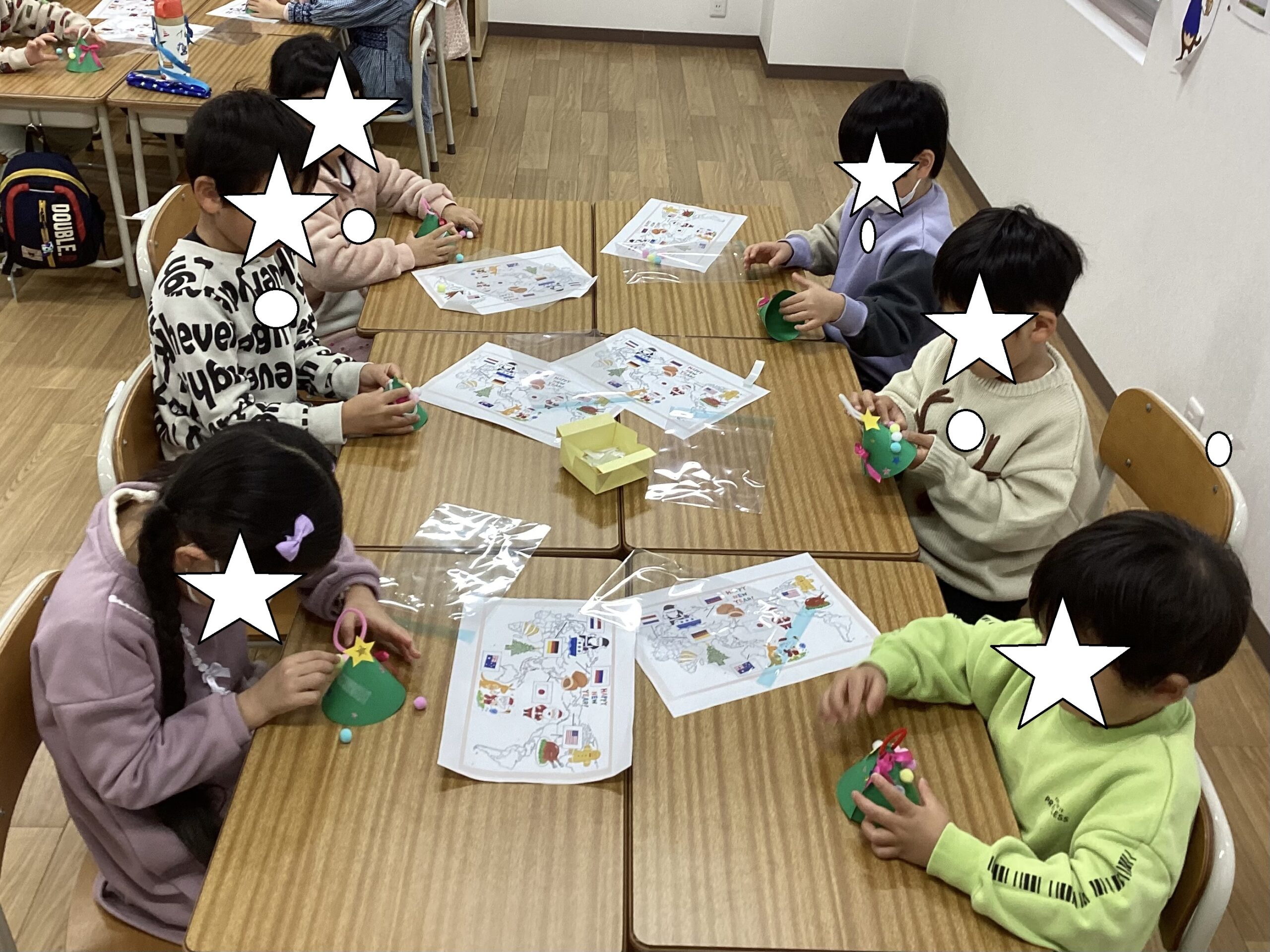先生のお話を聞きながらミニツリーに貼り付けていきます🌟