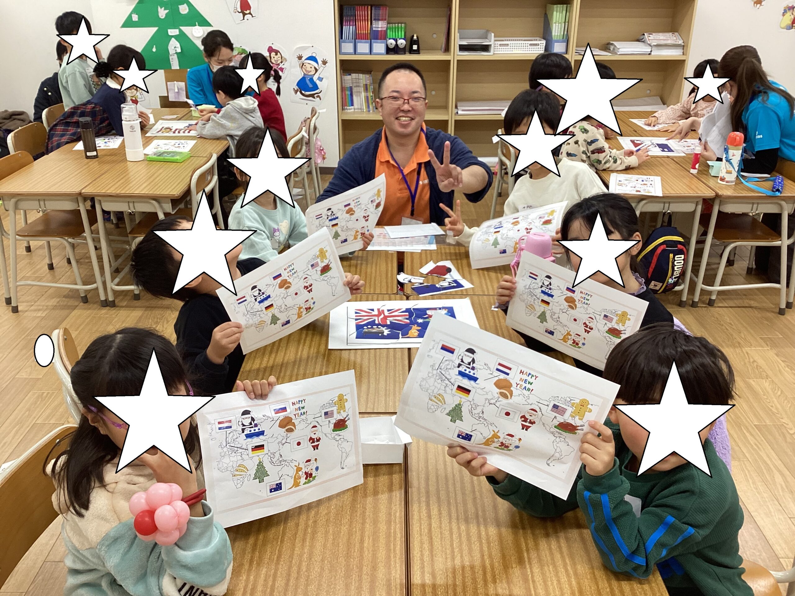 国の場所も確認し、国旗シールを貼って世界地図を完成させました!