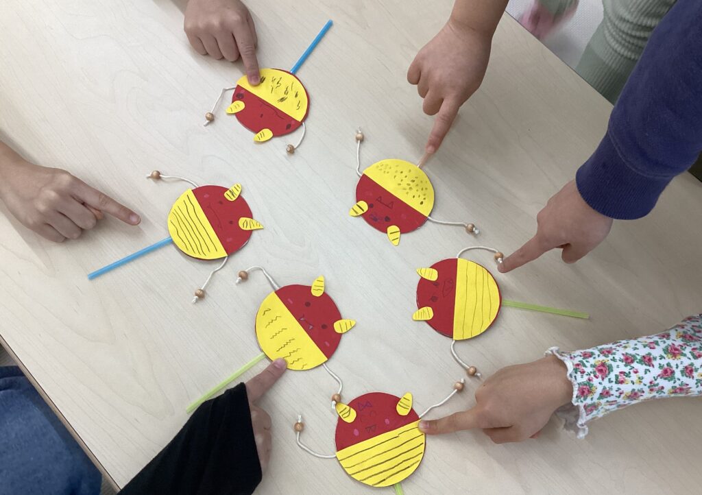 みんな迷うことなく模様・お顔をかいてくれて、素敵なでんでん太鼓が完成しました!!