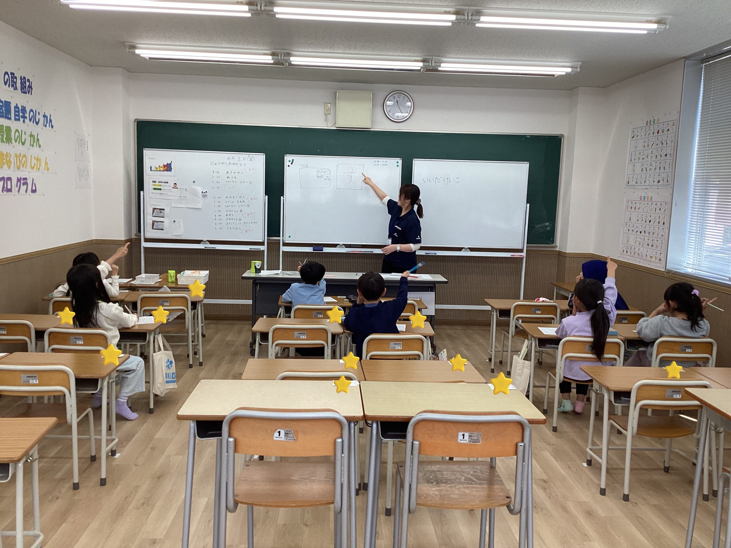 さて、本日は1年生さんにとって初めての国語の授業でした。1年生の最初は「ひらがな」からスタートしました。すでに練習しており、ひらがなを書くことができる、という子も多くいますが、書き順や、バランス、とめはねはらいを意識して、みんなで空書きをして書き順を確認しながら、丁寧に練習していきました。初めての授業でしたが、最後まで集中を切らさずに取り組んでくれた子が多く、素晴らしかったです✨