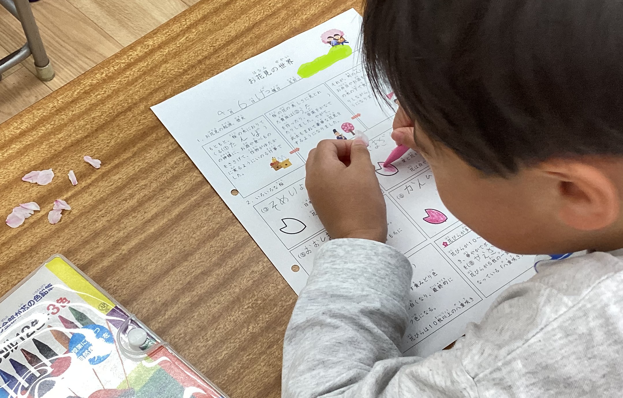 秀英KIDSオリジナルのワークシートを使いながら、どんな色のさくらなのか、想像して塗っています…。