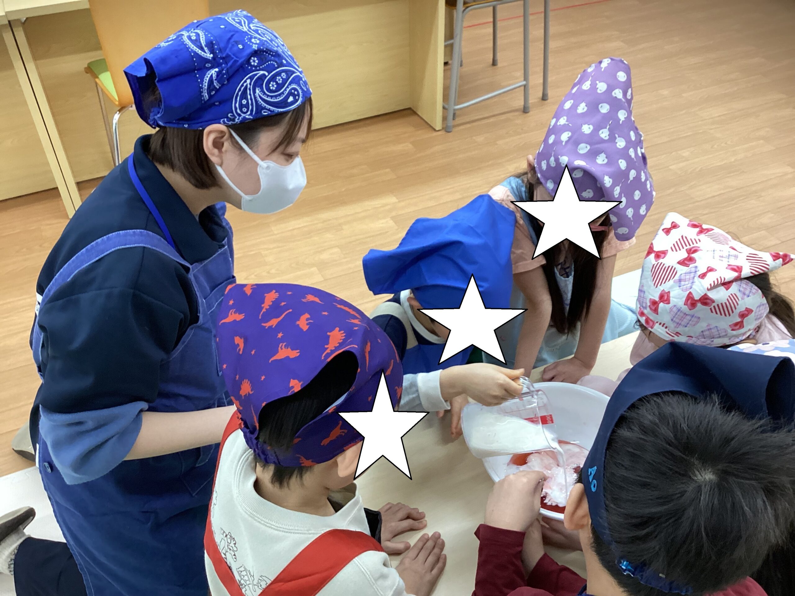 「ふわふわ生クリームのヒミツ」では、袋に液体の生クリームを入れてみんなでフリフリ♪